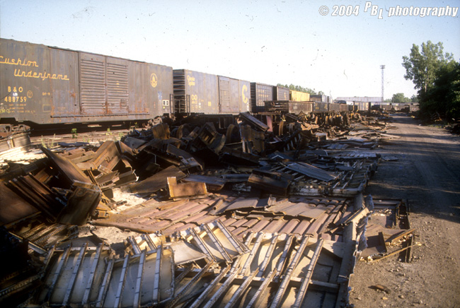 This is a photo of the repair tracks at CSX's Wyoming Yard from the late 1980's. Besides being a sizable classification yard for traffic to and from Chicago, Wyoming Yard also boasts a large car repair shop that handles a significant amount of jobs for CSX. The photo above is looking south and shows a one of several repair tracks with a line of Chessie System boxcars waiting their turn for the shops. In the foreground is the scrap track where cars that are too damaged to be repaired are torched to the ground, sometimes with loads still in them, to be sent off for scrap.