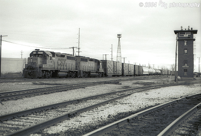 An eastbound CSX mixed freight with a matched set of GP40's pulls past Plaster Creek tower on its way out of Grand Rapids in 1988.