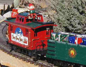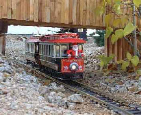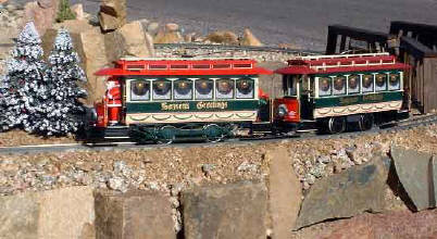 Christmas Trolleys became part of our Holiday display. The drive on the lead trolley has been converted a Barry's Big Train original. The motor and gears in the Bachmann drive on the "trailer" have been removed so the wheels roll freely. |