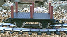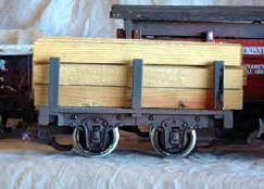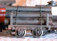 made from the 4 stake flat car and now carries pipe for the mine. The load is held down with special straps so they will not shift on the mine track. |