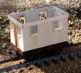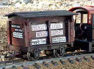 and effects unlimited. Three ore cars were purchased on "Special". The first of the set of 3 cars was stripped and converted to a "Prescott Canyon Mining Company" Supply Car, which new serves as the "battery car" for the PCMC Porters. |