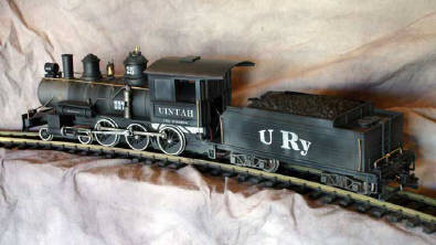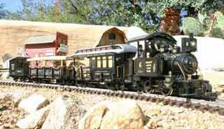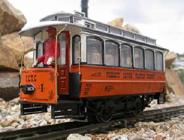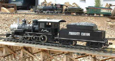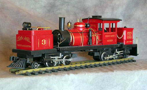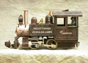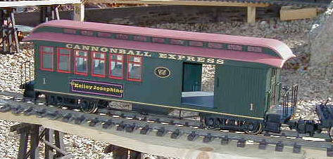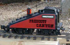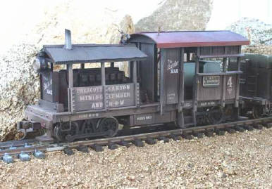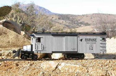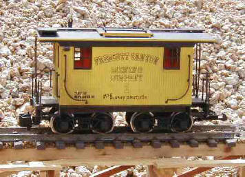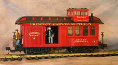 Combine as it came out of the box. The left image shows the car 2 3/4 inches shorter, cupola added, repainted, relettered "Prescott Canyon Southern" and named for grand daughter "Kelley Josephine". This car is part of the new "Red Garratt Train." |