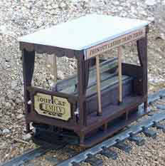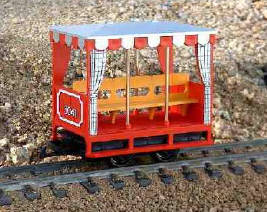 shops, the 2 cars are transformed into the "Prescott Canyon Train Tours" "Tour Car Emily" (r) and "Tour Car Amanda" (lr) ready for tourists to take the tour on the PCSRR main line and the Prescott Canyon Mine Loop. LEDs have been installed as EOT devices for passenger safety. Batteries are hidden under the seat and the SPST switch has been hot glued to the bottom for easy access. |