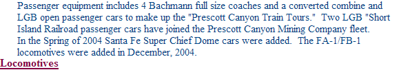 The locomotives on the PCSRR are Bachmann 10 Wheelers, 0-4-0 Porters, 2 LGB 0-4-0's,