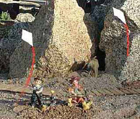 Mary "Big Train Show" and saw the kites on the "Del Oro" layout. Purchased the figures at a 99 cent store and adapted the kites to them. The "Kite Kids" are a favorite of the visitors to the PCSRR. |