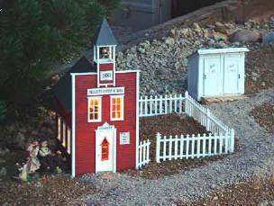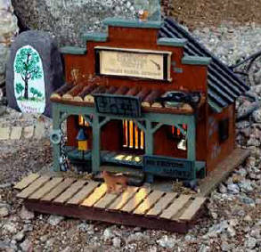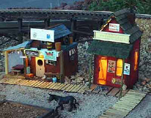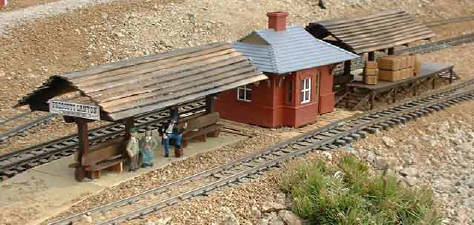 station. Remember "High Noon"? Prescott Canyon has a small station and scratch built covered platforms for passengers and freight. The station is a kitbashed PIKO "Toy Train" kit which fits the layout very well. Platforms and station are lighted with the "Malibu" system |