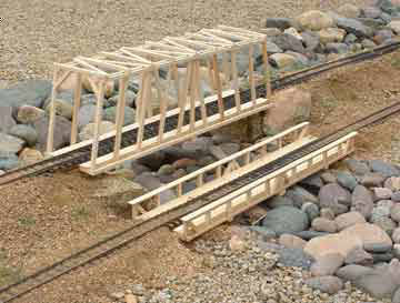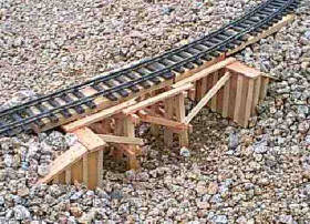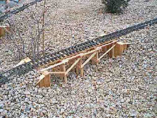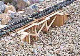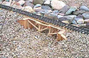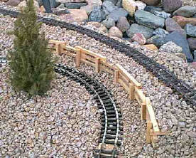 the track on the double curve mainline loop to provide drainage and a good visual effect. The abutments have also been made from natural cedar. |