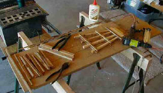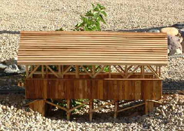 creosote and installation. Supports are made of cedar, redwood slats and glue. An air nailer was used to make construction much more simple. Supports were then dip-stained to look like creosote. |