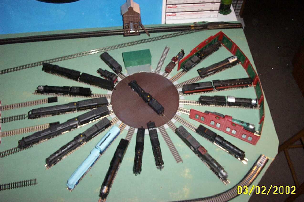 The turntable is motorised, and has both a siding track entramce and a mainline entrance track. There are also disel services here and a backshop. The wreck train siding is at the far left in this photo.
