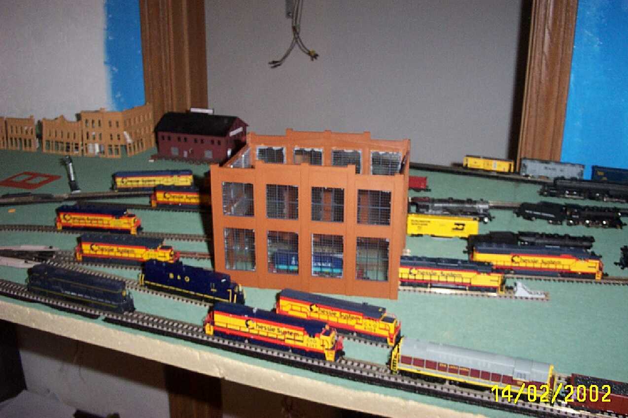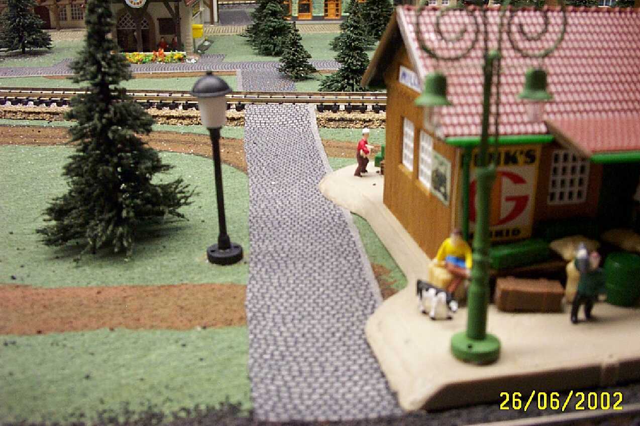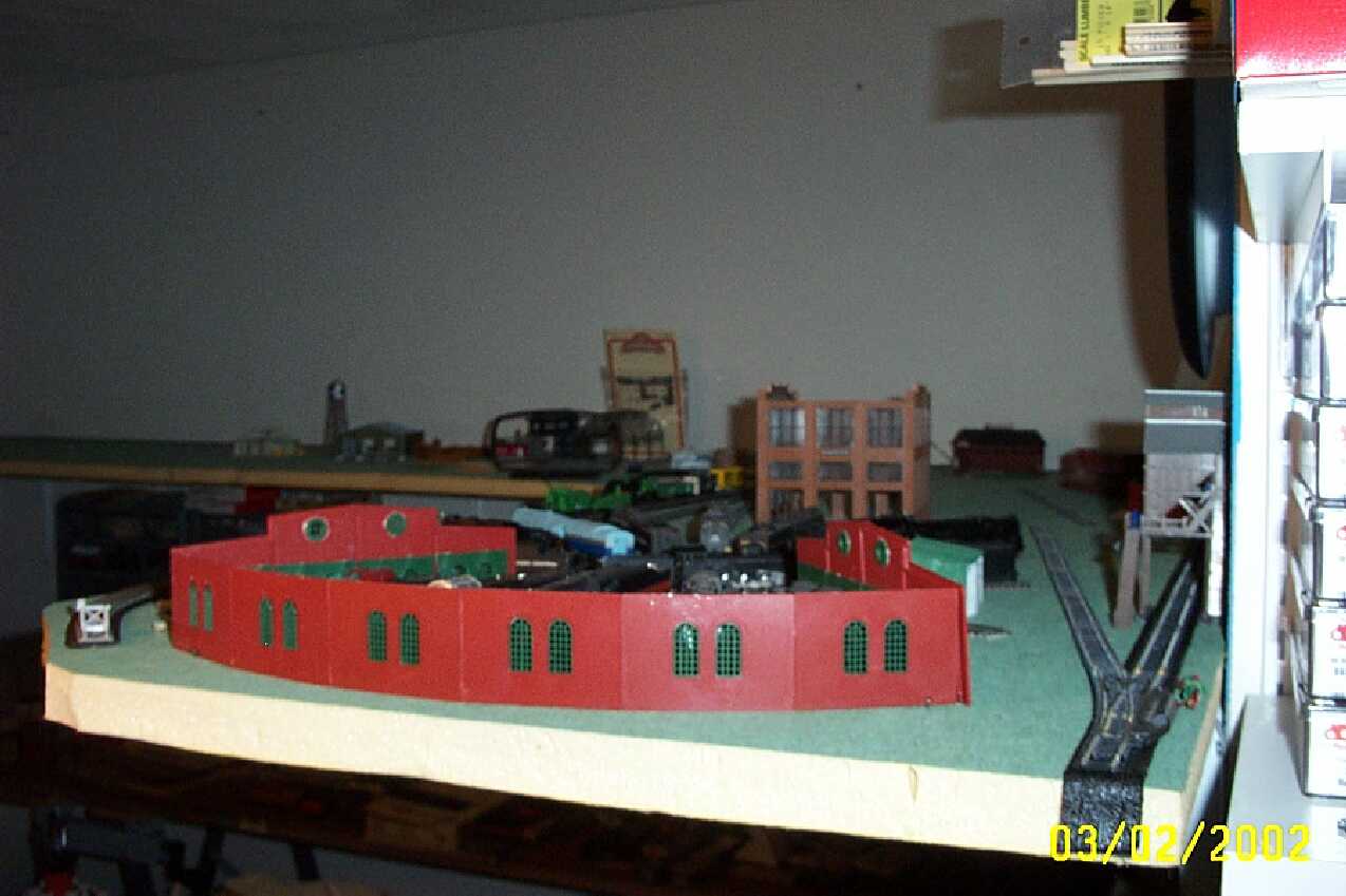 This is another shot from higher up, the blue building on the left is an ice house from walther's. There are some black and blue paper towel sections along the wall [outer loop track] that will be built into either a petrol station or a grain elevator. Location is still being investigated.
