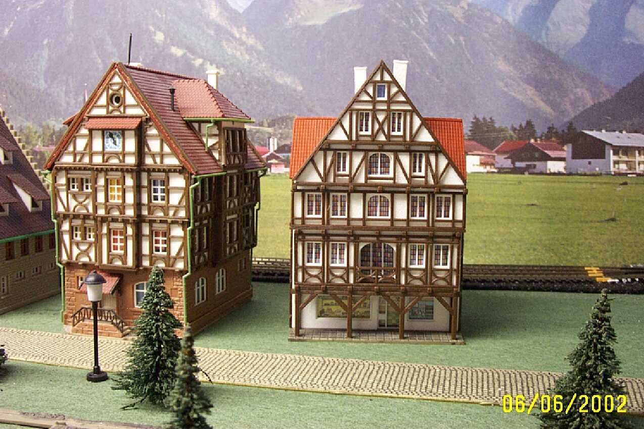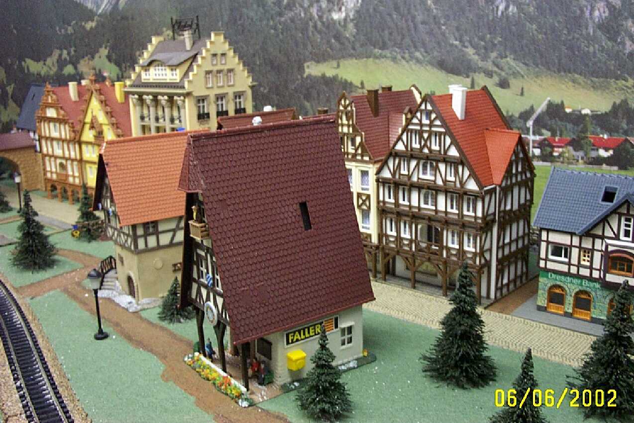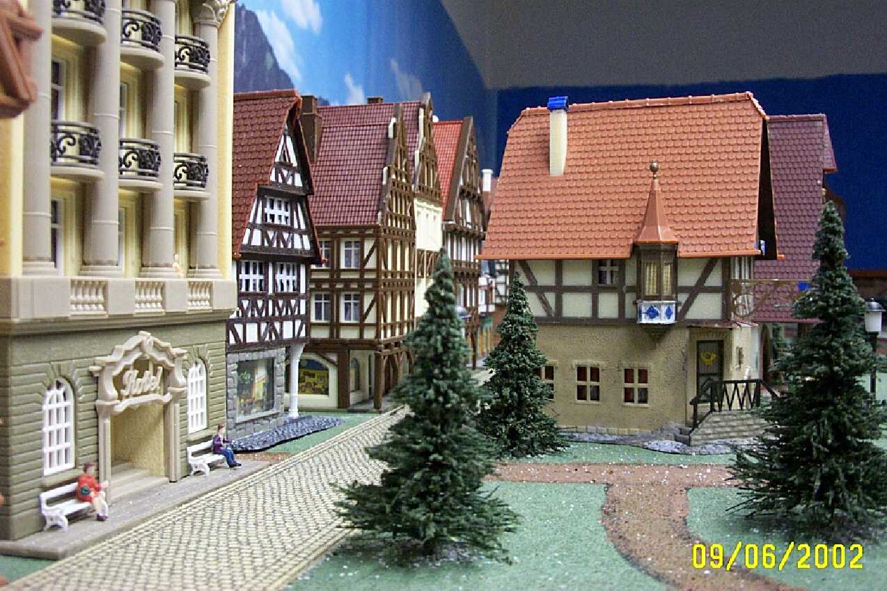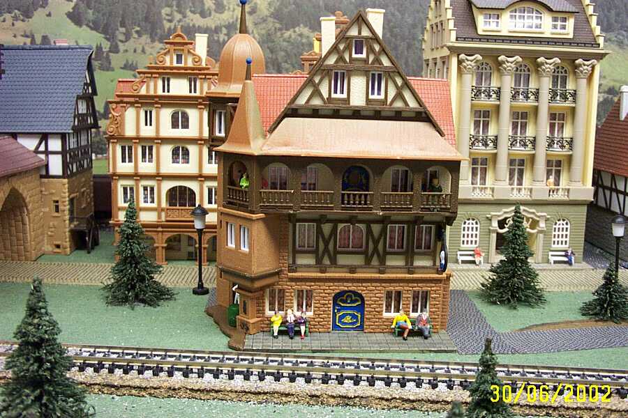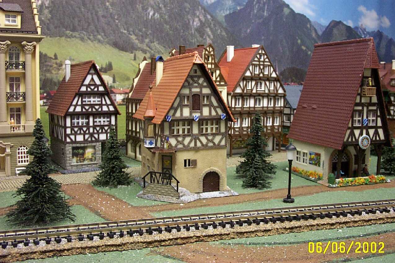 A row of shops with living quarters above make up the back row, along with a five star hotel [the tall tan building]. The next row is Gasthouses, public buildings and a freight station at the far right. The A-frame building in this shot is the village hall, and you can see the mayor on the balcony.
