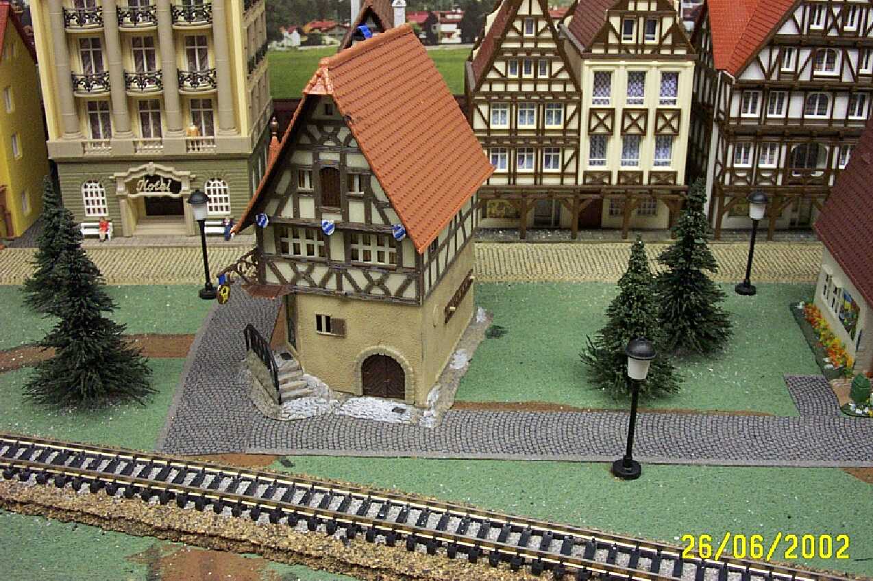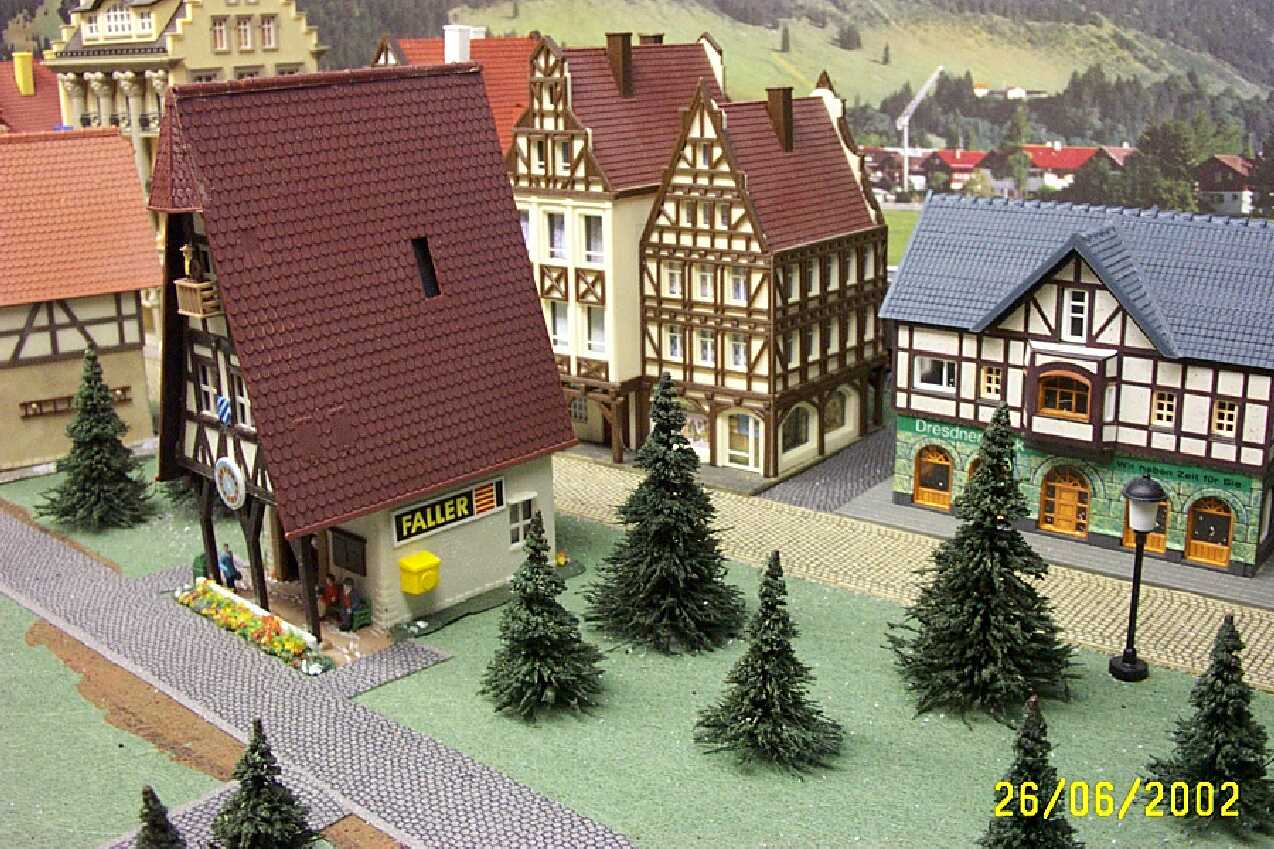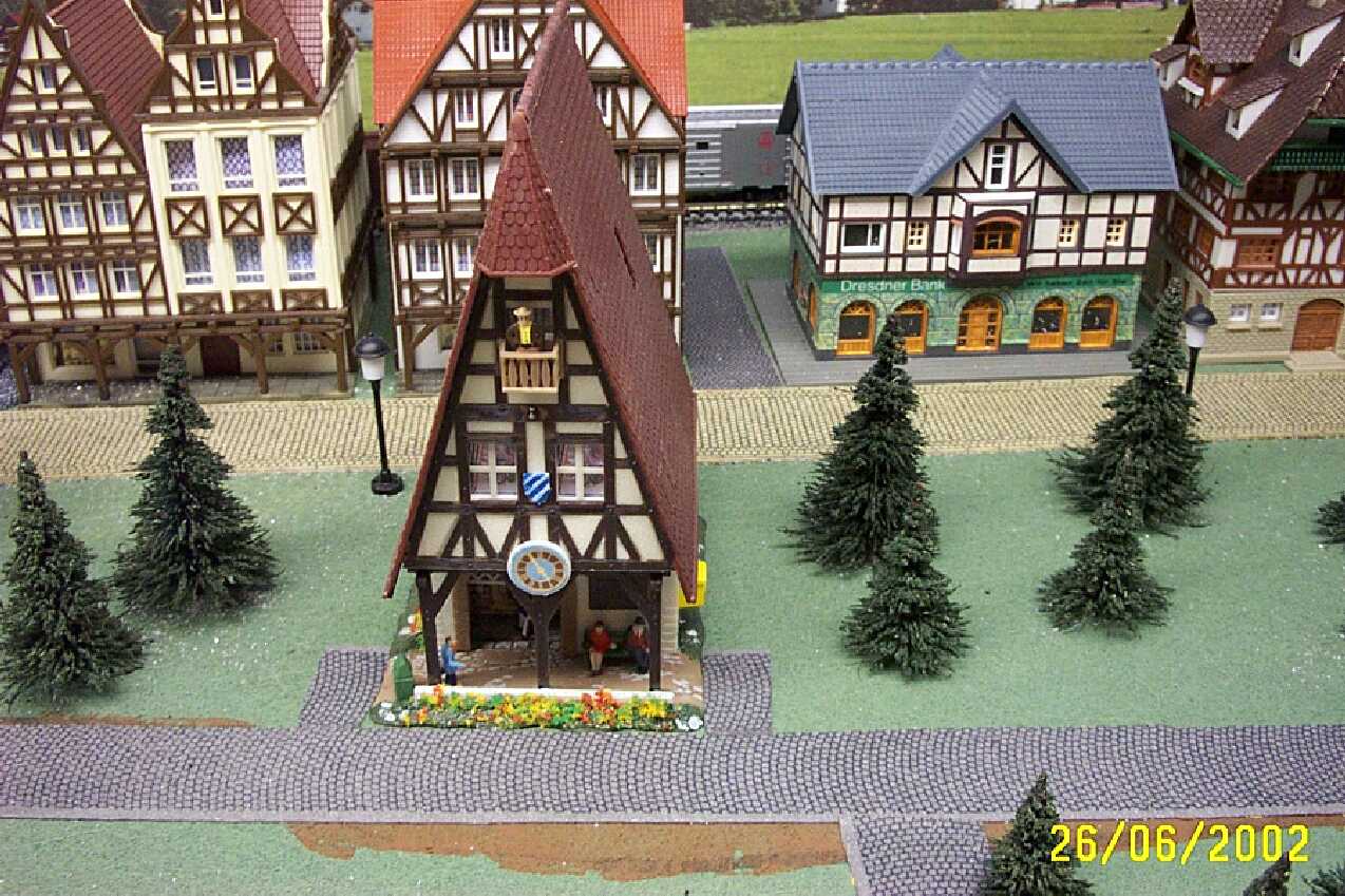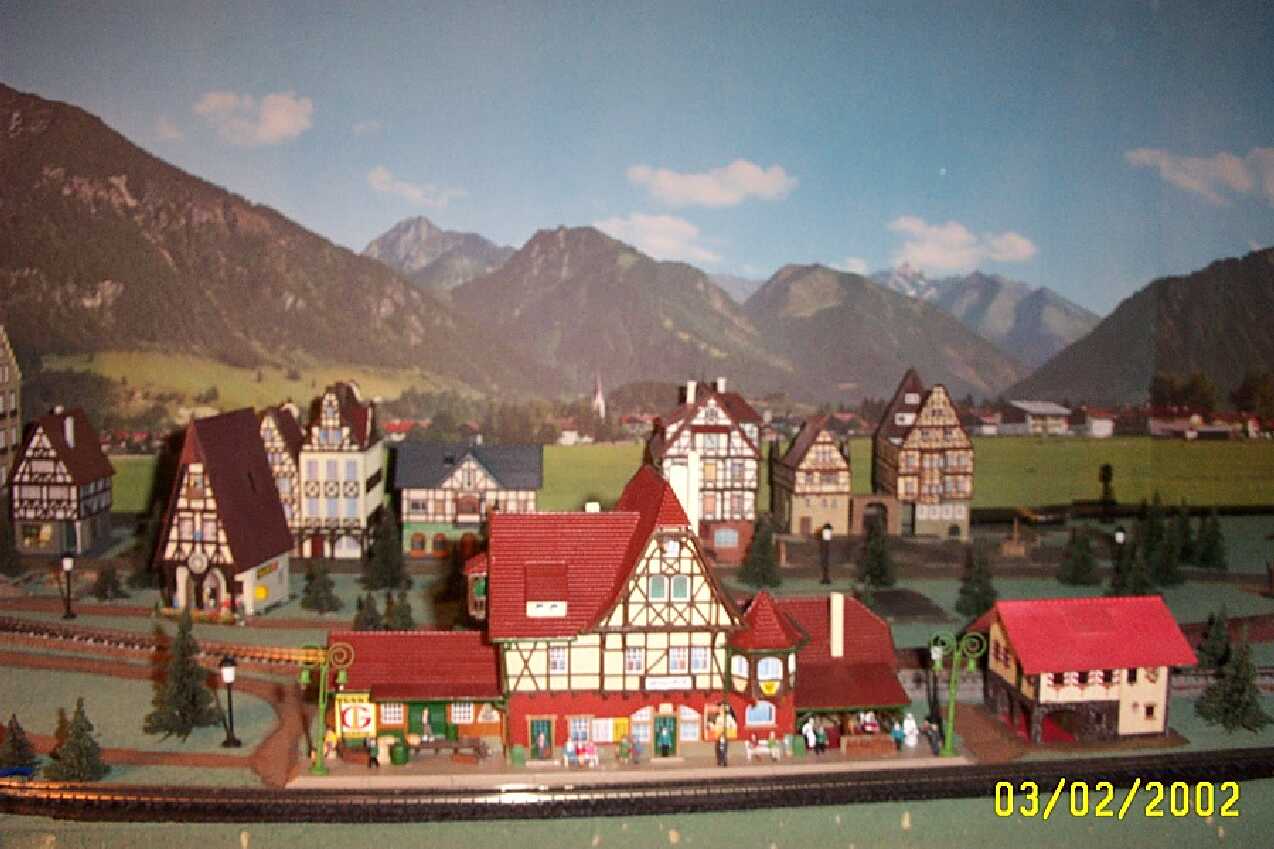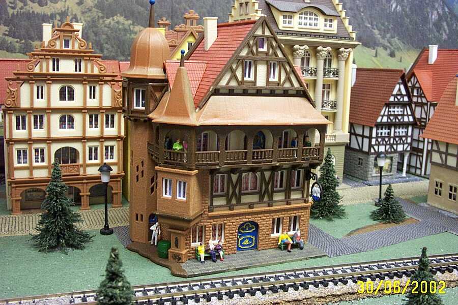 A row of shops with living quarters above make up the back row, along with a five star hotel [the tall tan building]. The next row is Gasthouses, public buildings and a freight station at the far right. The A-frame building in this shot is the village hall, and you can see the mayor on the balcony.