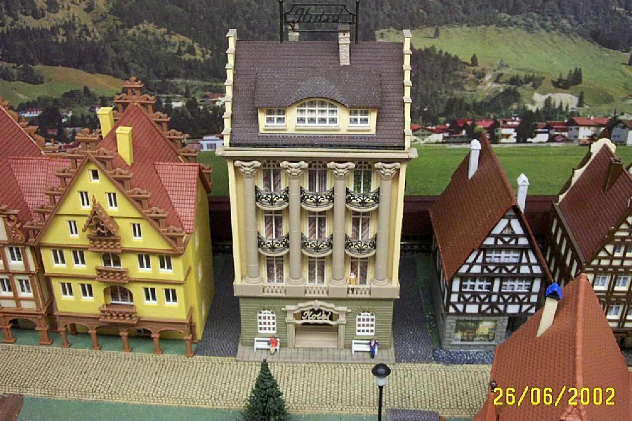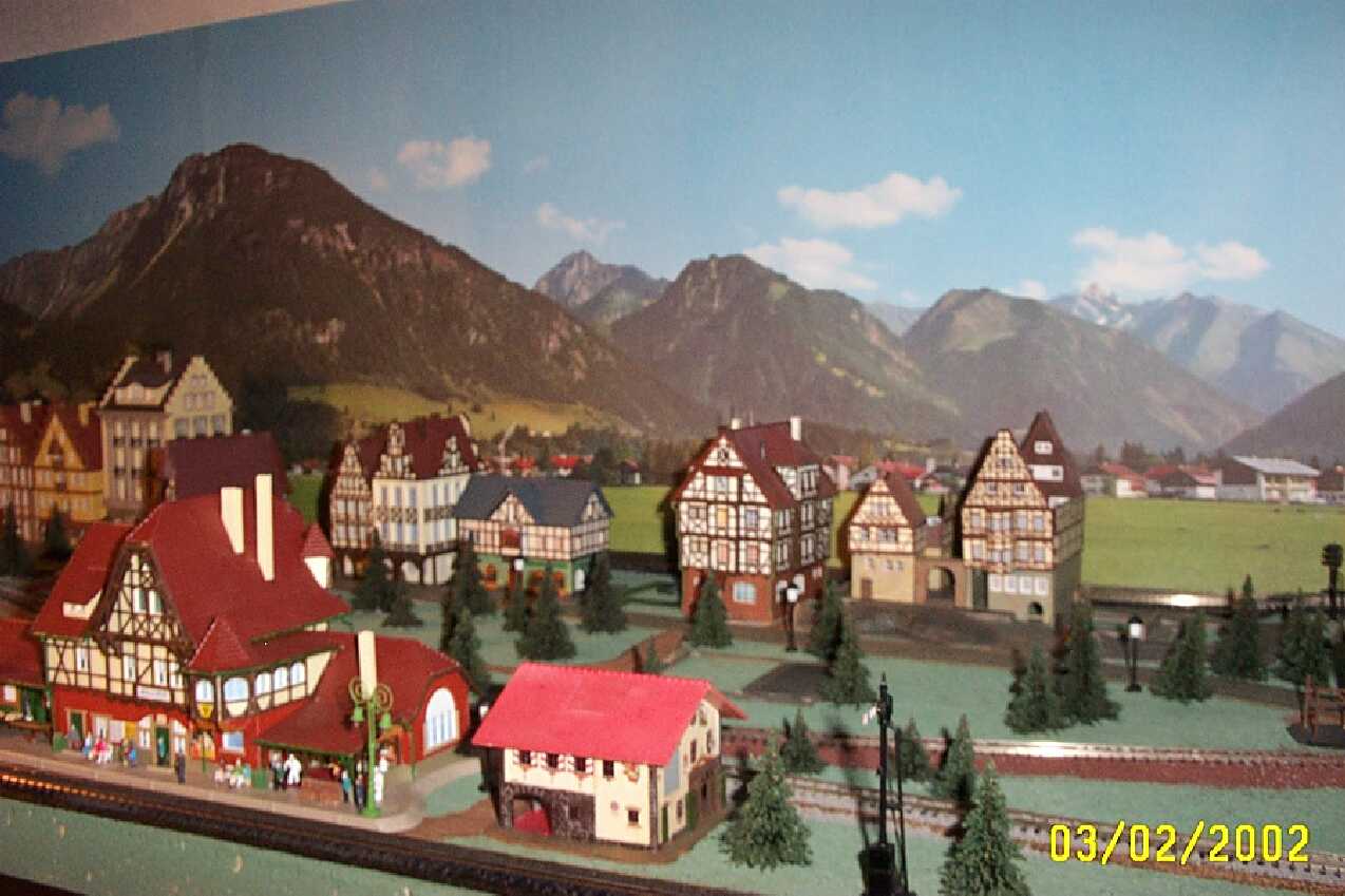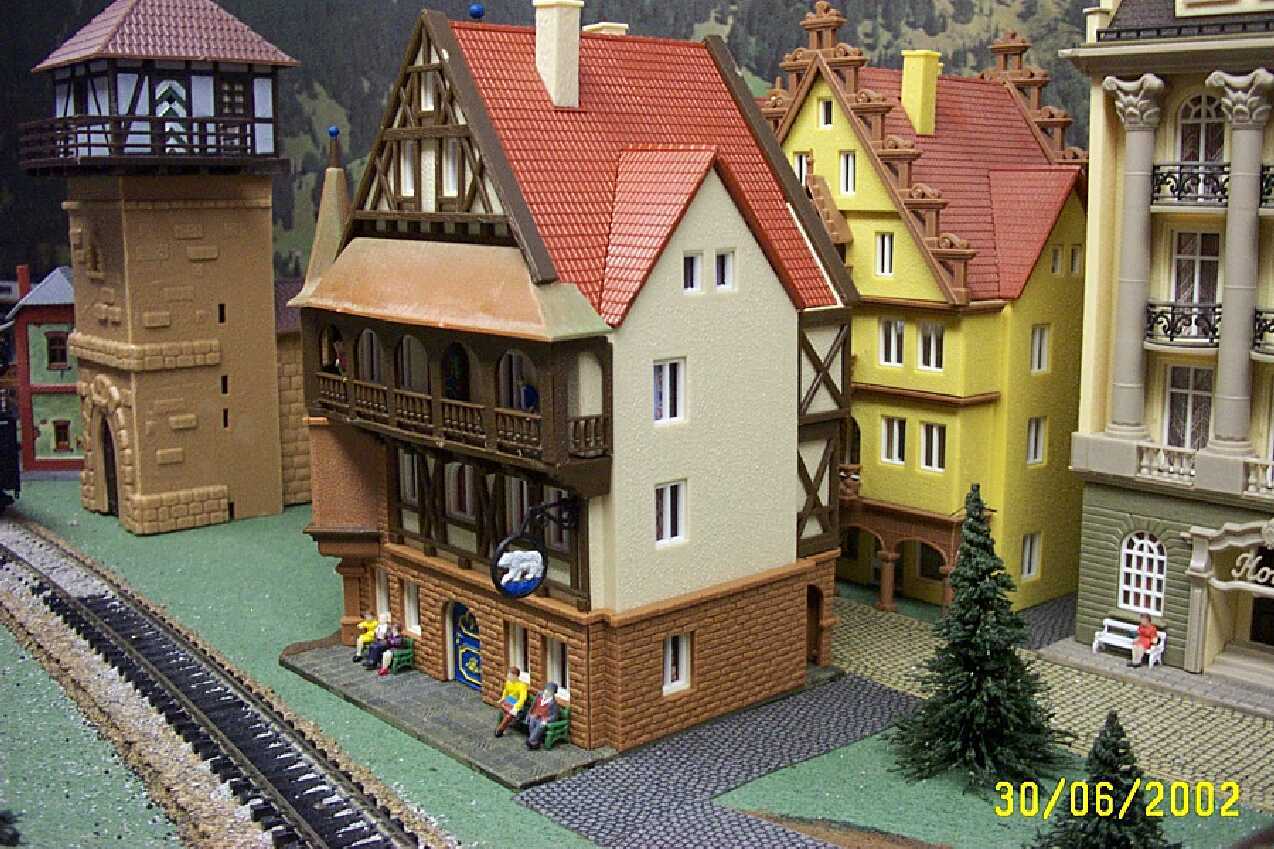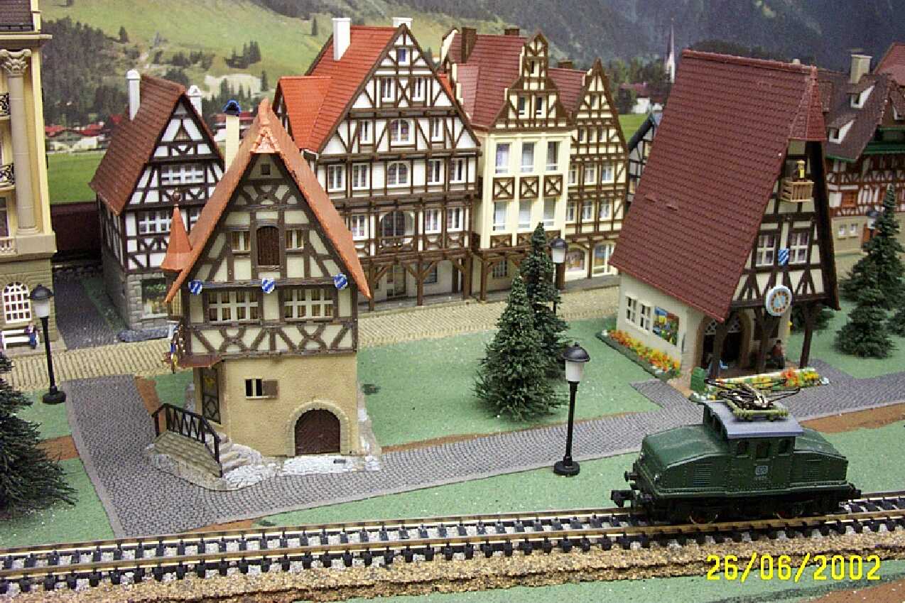 A row of shops with living quarters above make up the back row, along with a five star hotel [the tall tan building]. The next row is Gasthouses, public buildings and a freight station at the far right. The A-frame building in this shot is the village hall, and you can see the mayor on the balcony.