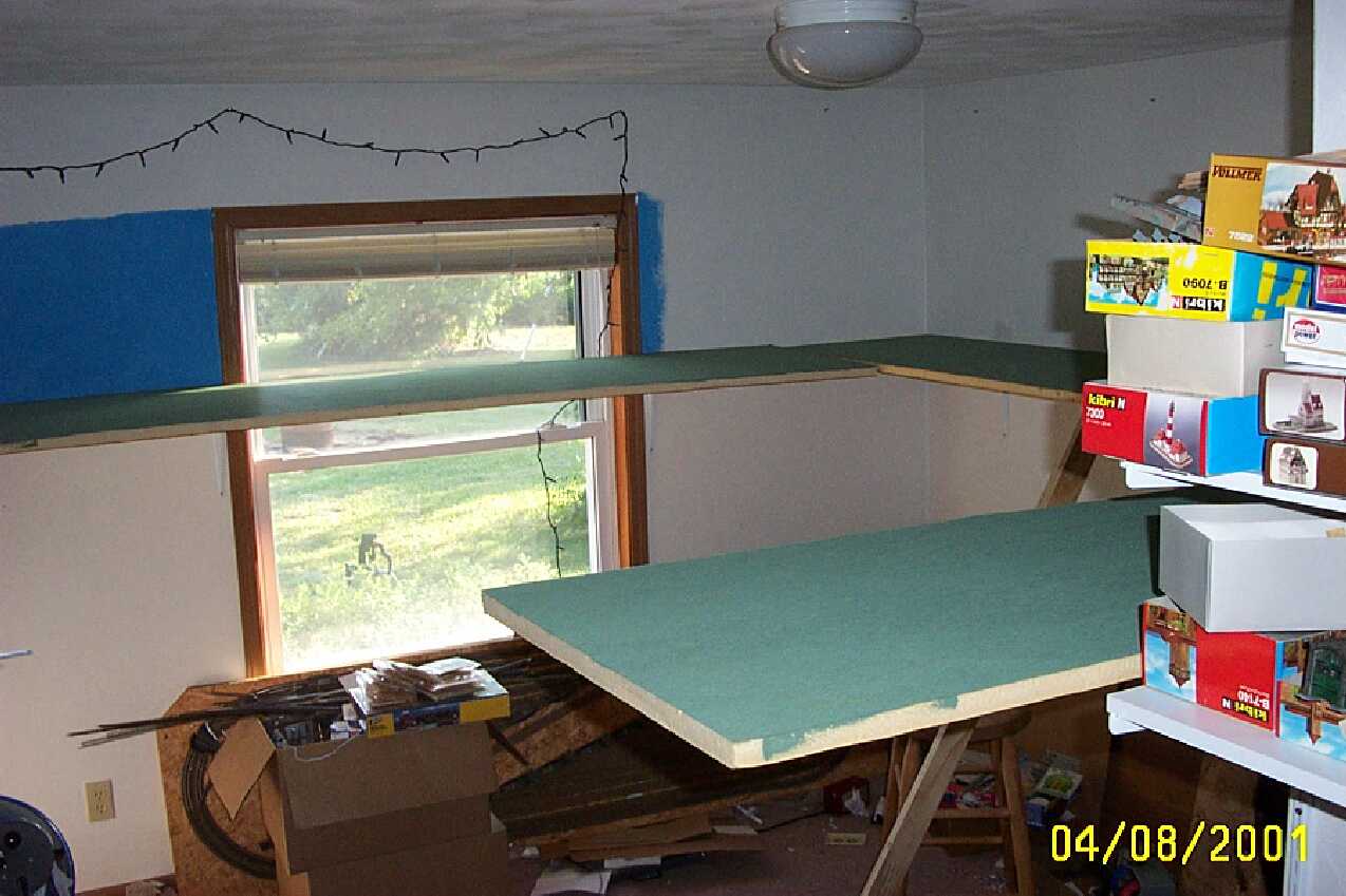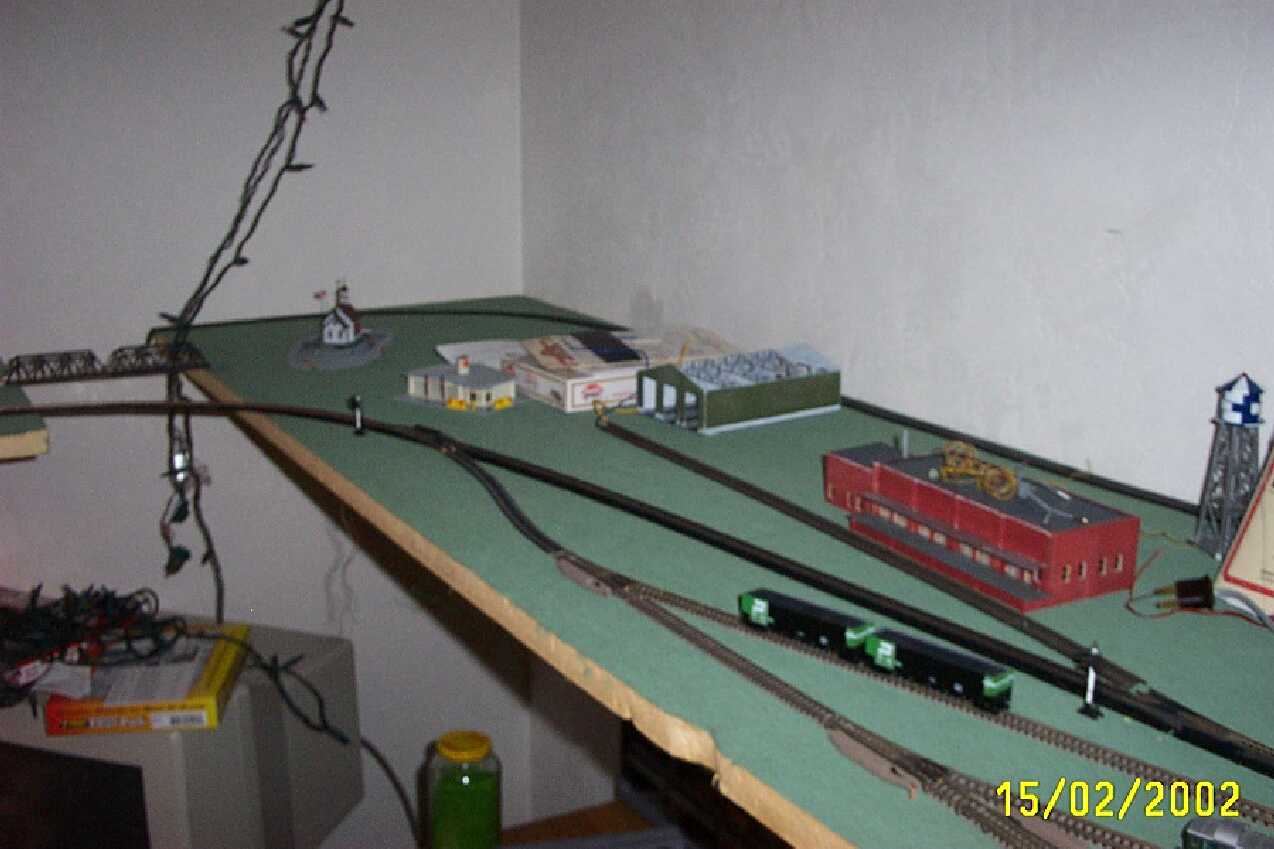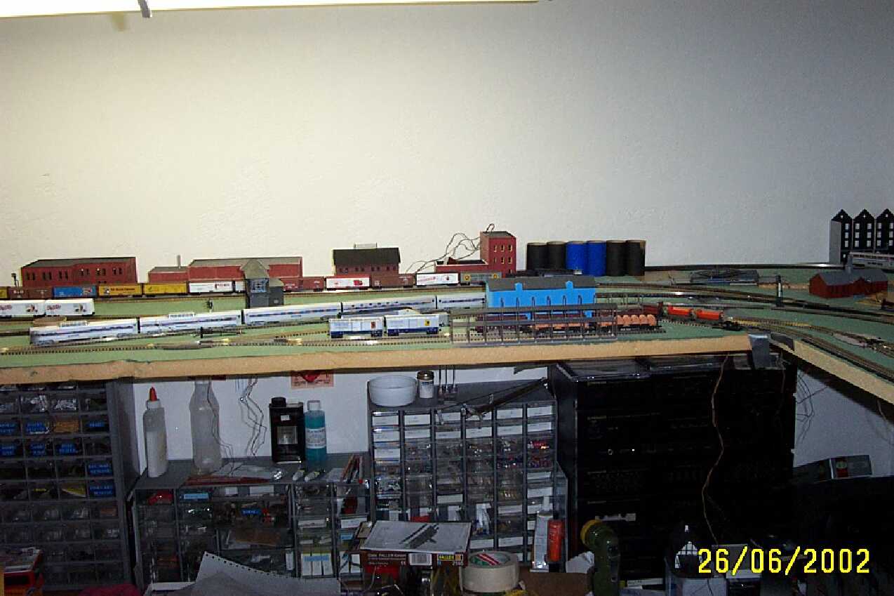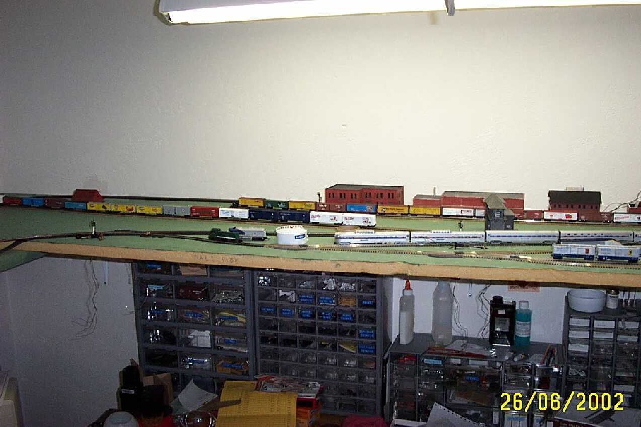 West wall shot showing work bench underneath layout. Passenger train [AMTRAK] is on the siding leading to the back shop. the freight train is on the TROLL junction track, and there are some frieght cars at the back siding next to some factory buildings by DPM. The buildings are in front of the outer loop.