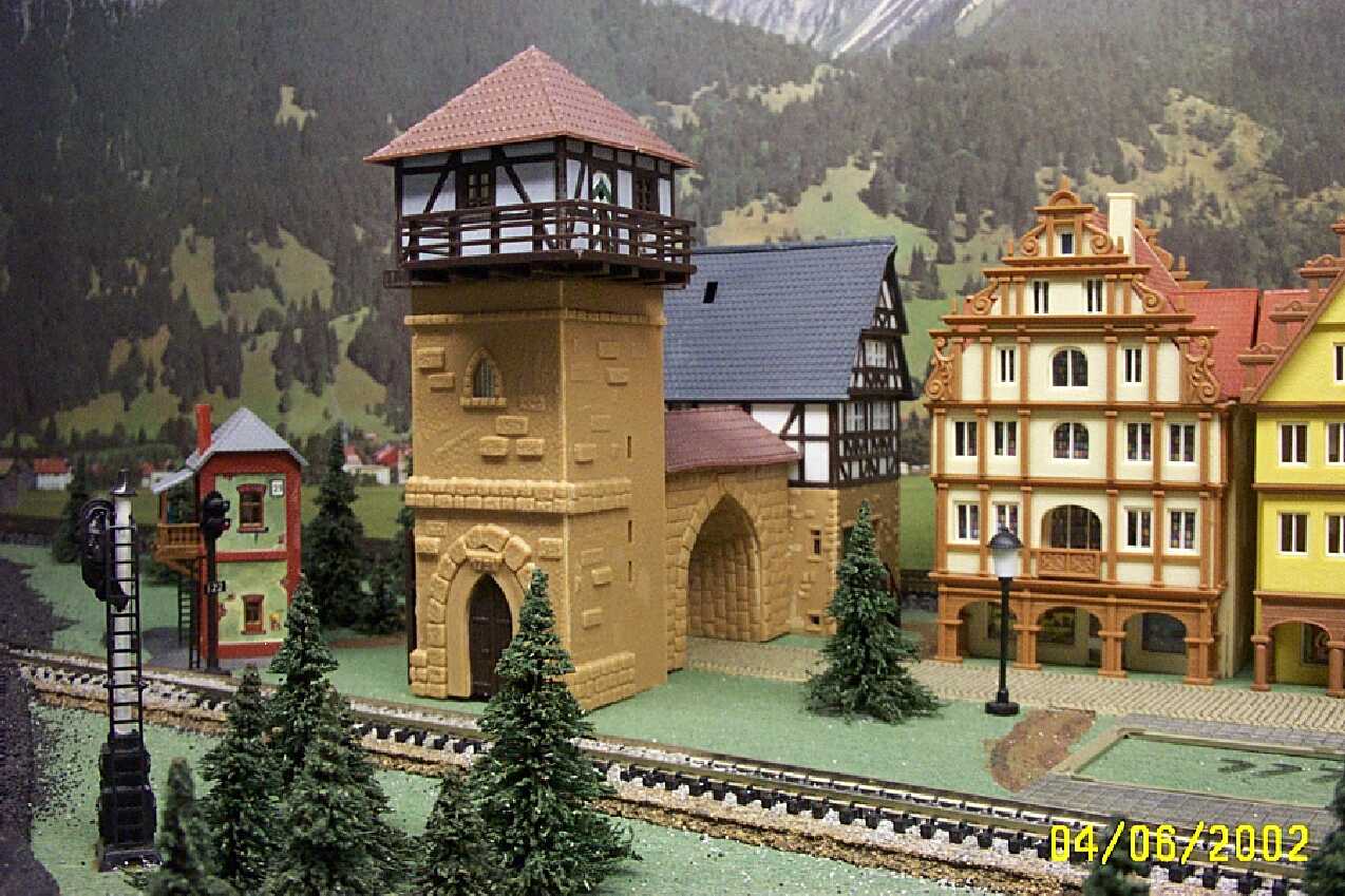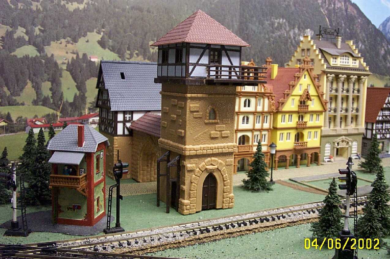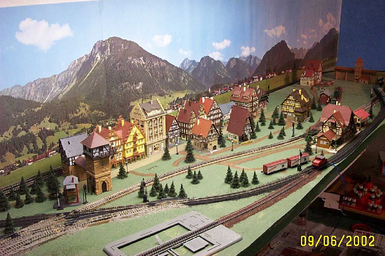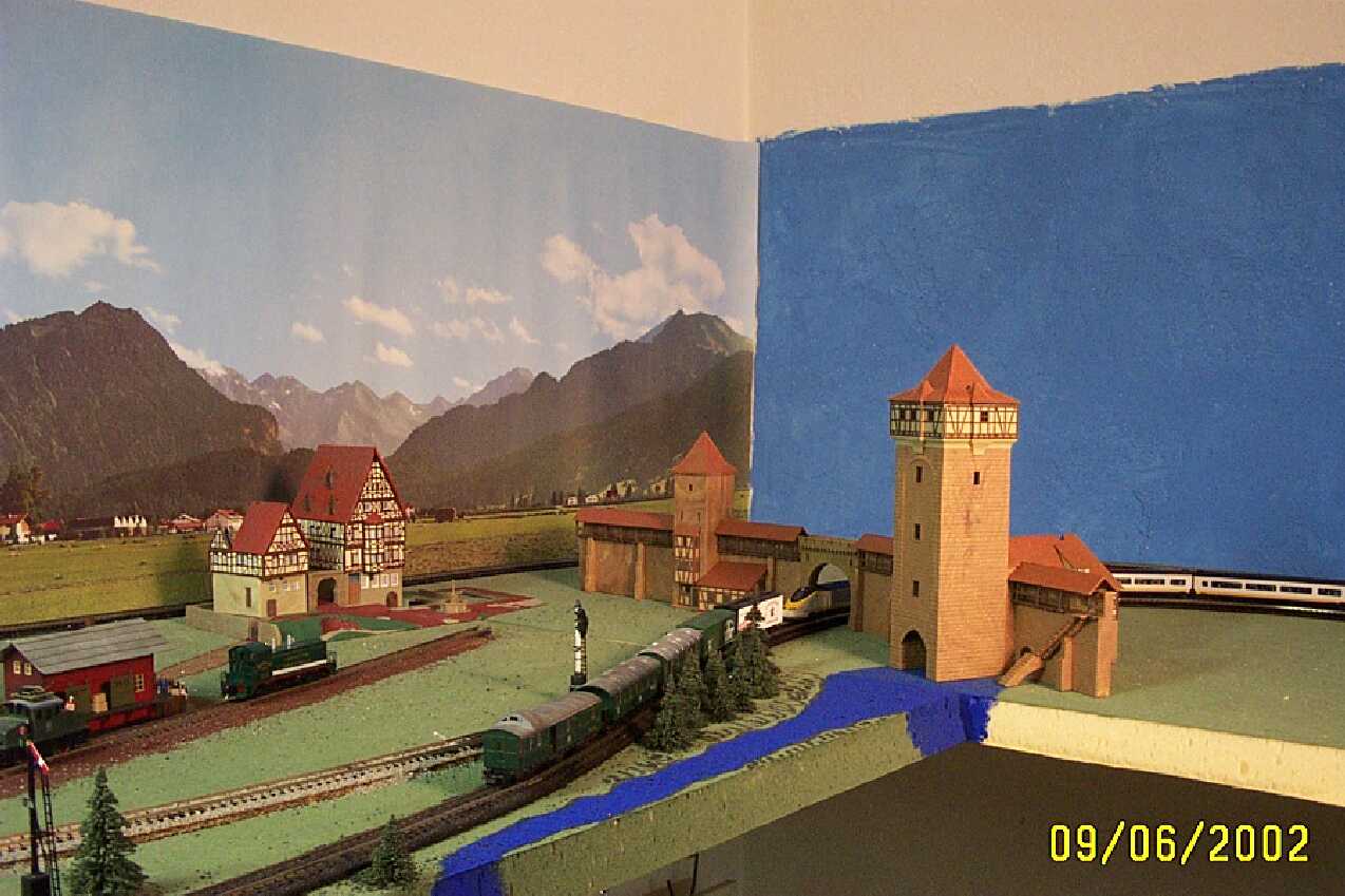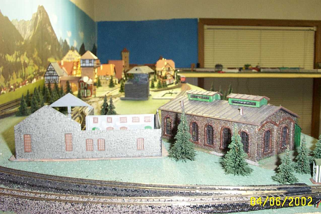 Starting from the left you see trackwork leading back [left] to the engine facilities. The foreground is where the brewery is to be built [had to install it when the track went in]. The small junction tower is protecting the mainline [black ballast] from the siding [light grey ballast]. The tracks against the wall are the outer loop [furthest] and a pocket siding. A city gate and tower marks the beginning of the village, and on the far right you can see an old city wall. The exact placement of the city wall is not yet determined.