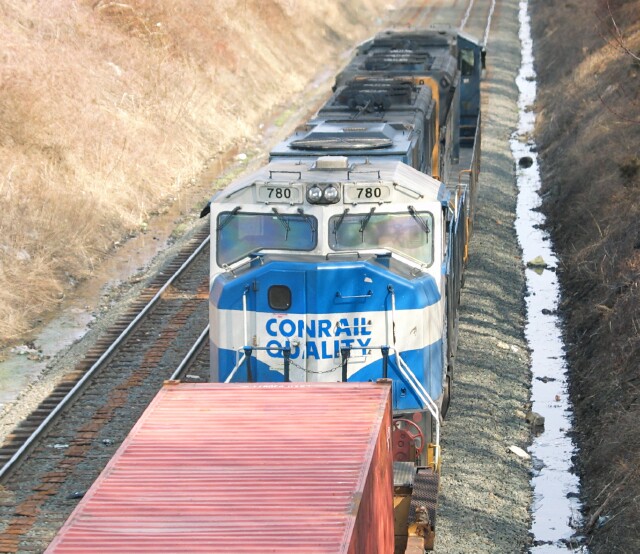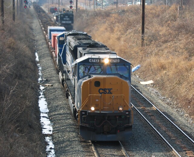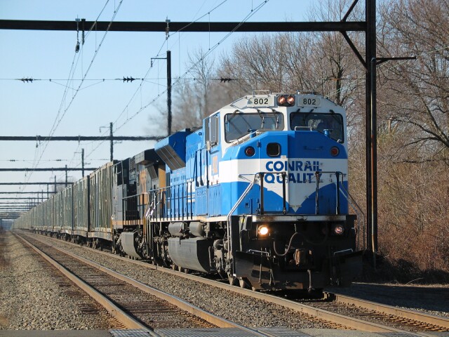 | Approaching Heacock Road, CSX SD80MAC 802 takes K276 and its load of empty trash containers north on February 18 2004. |