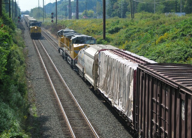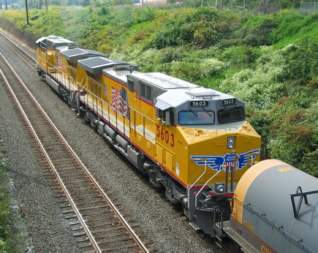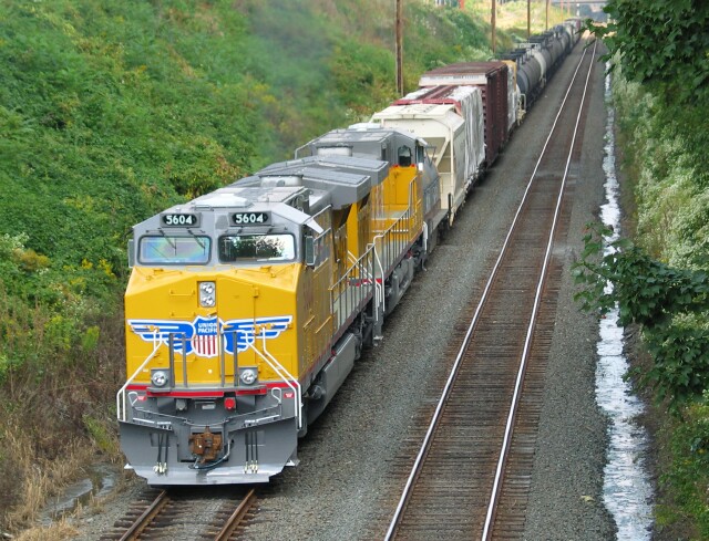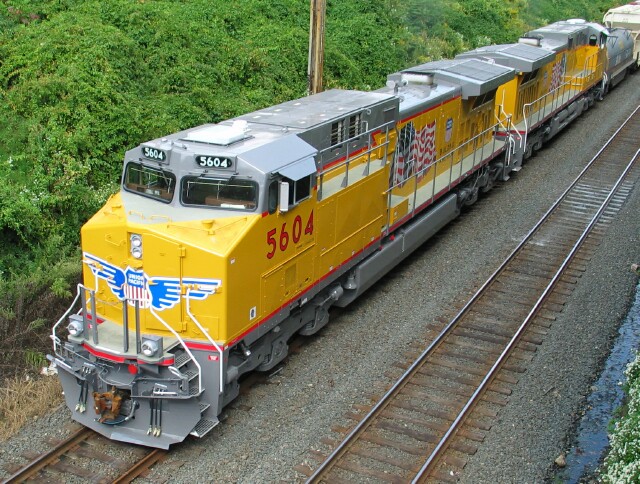 | For the third day in a row, a brand new pair of UP units are on one of the Selkirk-Camden trains Q417 and Q418. Today's engines were UP 5603 and 5604. |