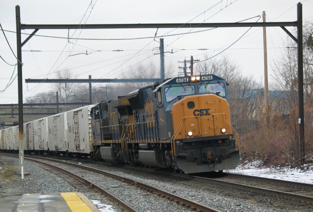 | A late running CSX K651 led by SD70AC 4704 approaches Olney Station |