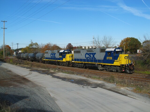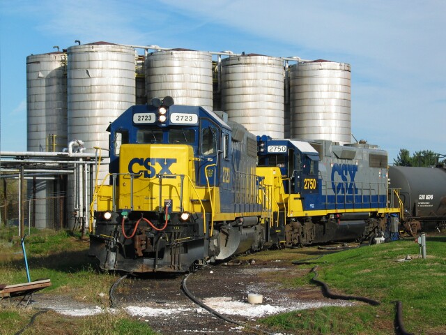 | Before heading back to the yard, one last chore: work the soap. Crystal PMC receives tank cars loaded with food grade wax for use in household products. CSX 2723 and 2750 cross Eighth Street on the siding as B738 shoves a car back into Crystal's small yard. |