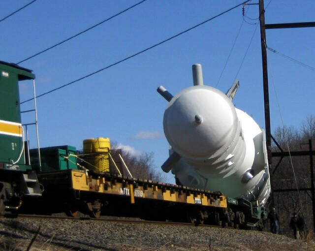 | Norfolk Southern moved a heat exchanger from Allentown to Manville to Morrisville this week. Nearing the end of its journey, the train, symboled W996 while on CSX rails, starts the climb from the CSX Trenton Line to the NS Morrisville Line via the Wood Connecting Track. Due to clearance concerns, an eastbound SEPTA local was held at CP Wood until the dimensional move cleared the interlocking. These moves happen every few months, for details of one such move in July 2004, click here and here. |