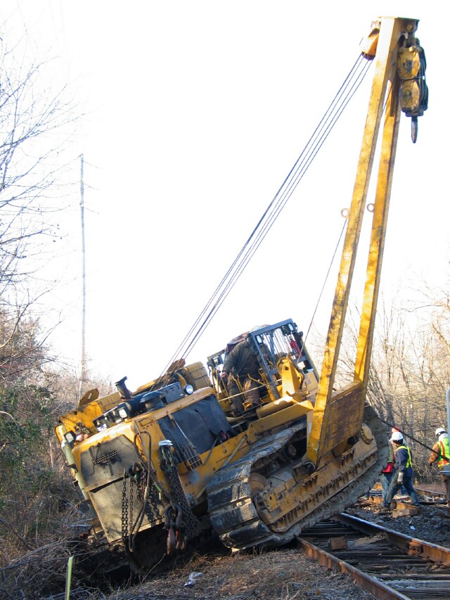 | Once the truck was in position, the next operation, lifting the car onto the rails, required a repositioning of the sidewinder. Driving one of these looks like fun, but requires a lot of skill. |