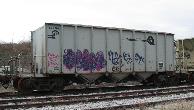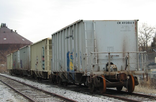 | Sitting on the same track as the hoppers on flatcars probably does not bode well for these cars. Hanging out in urban areas with their gray sides, these cars have become grafitti magnets. |