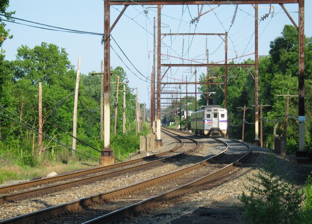 | The view looking south from the station. In 1856, this line looked much different, as it was single tracked and did not have the electrification infrastructure that was erected in the 1930's. |