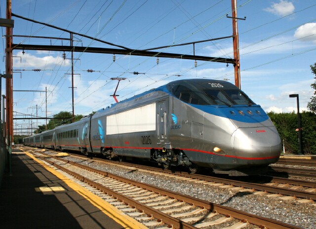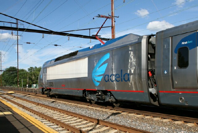 At its normal operating speed, photographing the Acela Express from a station platform is usually relegated to one or two approach shots and a couple going away shots. However, on Sunday afternoon, at least a pair of crawled by Torresdale Station for some unknown reason, and Steve Heelis was able to get each car as they passed at a mere 5 to 10 MPH. The first train looking south is pictured here. This train is looking north. Leading the second train, Set 20, was Power Unit 2026 (with AMTRAK logo and nose pinstripe). |