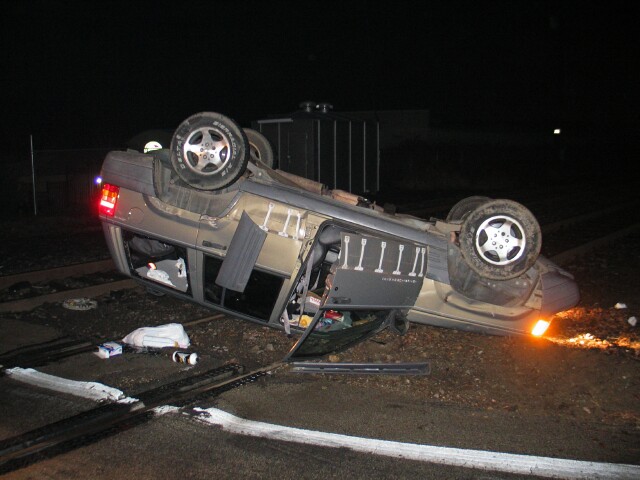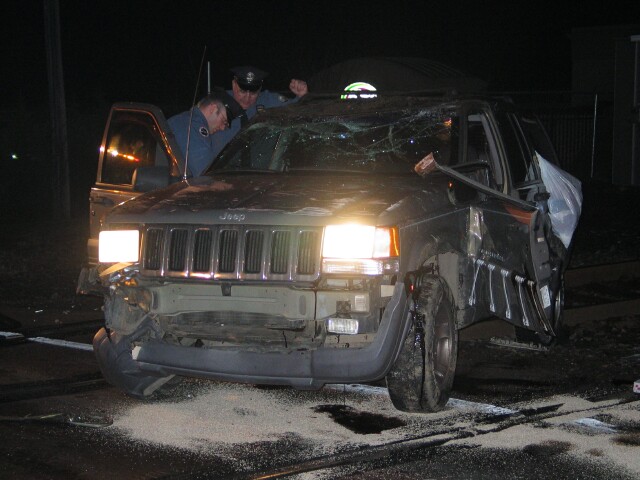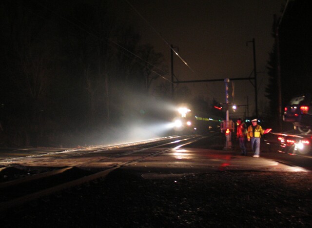 | Service on SEPTA's R3 West Trenton Line was temporarily halted tonight when a Jeep overturned onto the tracks at the Red Lion Road grade crossing in Huntingdon Valley PA. The grade crossing is infamous for accidents during the winter weather season, but it was a light coating of rain and possibly excessive speed that apparently caused this single car accident around 6:00 PM. |