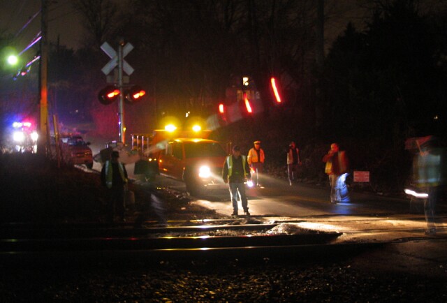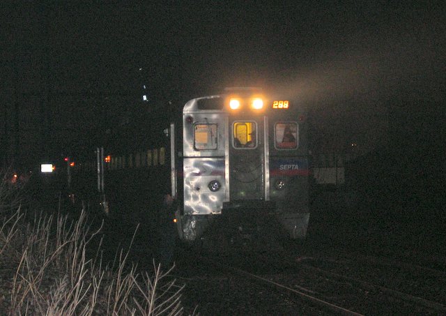 | After the Jeep and most of the debris had been cleared, SEPTA personnel on site walked the trains through the area until a track inspector could arrive to assess the damage to the track. |