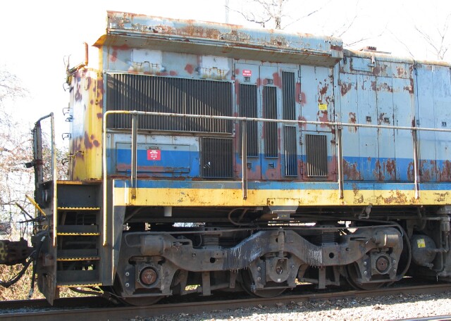 | The spotty application of primer makes it look like the elements have taken a toll on the unit since I saw it last April, but at least the radiator cover is back on. I do recall that 7064 was used for a short time in revenue service on the New Hope and Ivyland. Hopefully it will get some TLC when it joins the former NHIR 531 in Ohio. |