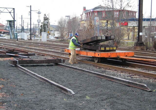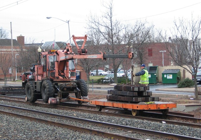 | The Swingmaster bringing ties from the staging area along the Madison Parking Lot down to the work area. |