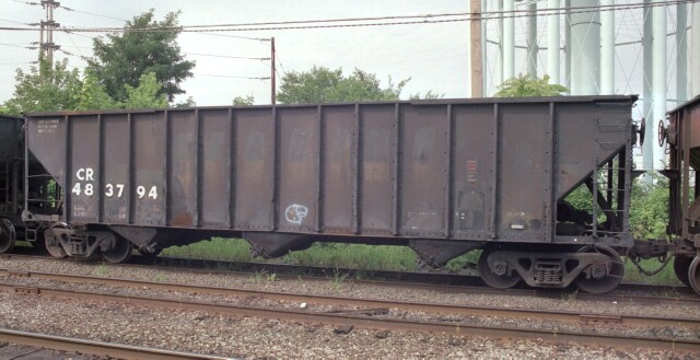 | CR 472893 is a former PRR H43 coal hopper that has had some serious patch work. |