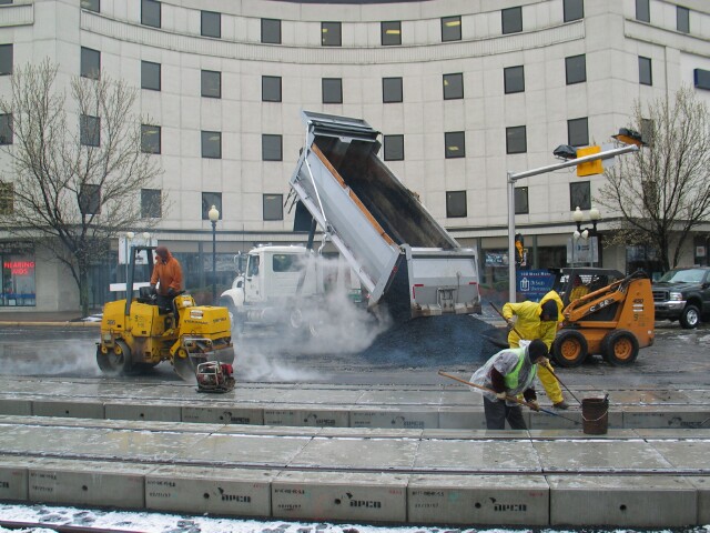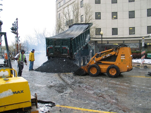 | After a sunny Saturday and a rainy Sunday, a snowy Monday seemed almost fitting as the first stage of the project wound down. The rails are in place and ready to be put back in service, all they need is a smooth road surface before Main Street can be reopened. |