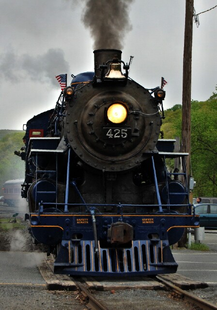 | Storming through Tamaqua, the 425 is hitting her stride. The engine was a real eye-grabber in her classy blue and gold paint scheme. |
