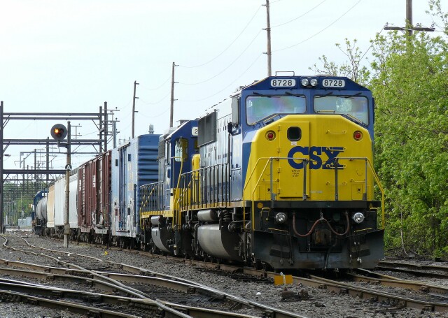 | John Almeida drove the 2 miles to Lansdale Yard to see an unusual sight for these parts. Normally the domain of ex-Conrail SD40-2's, GP38-2's and GP40-2's due to SEPTA cab signal requirements, earlier this month CSX found itself short of big iron to send up. During the first week of May, a quartet of four axles held down both C746 transfer and B738/B745 local jobs. When one of the four axles had to be shopped, a surprise visitor in the form of CSX SD60I 8728 got the call. |