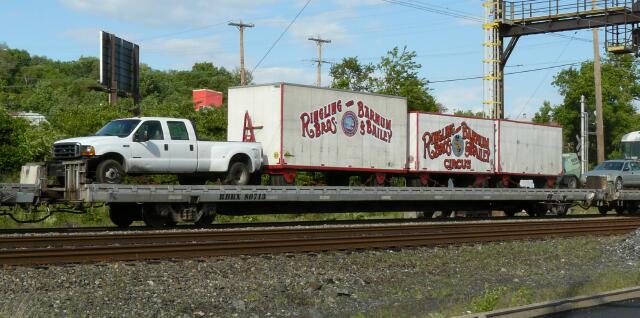 | *COFC, the Circus CONTAINER CARS, are prototype "kitbash" cars: two, 40-ft. containers were added to the cars with a joining doorway between them (on EACH car), and were permanently mounted on the originial TOFC-service flatcars. |