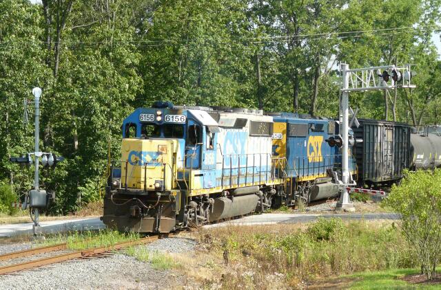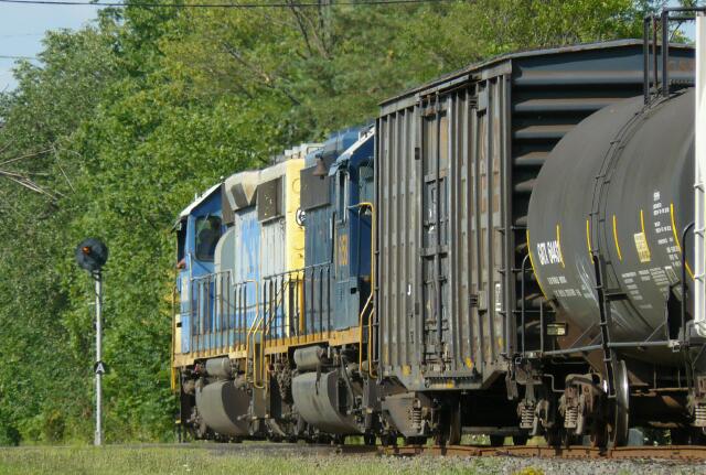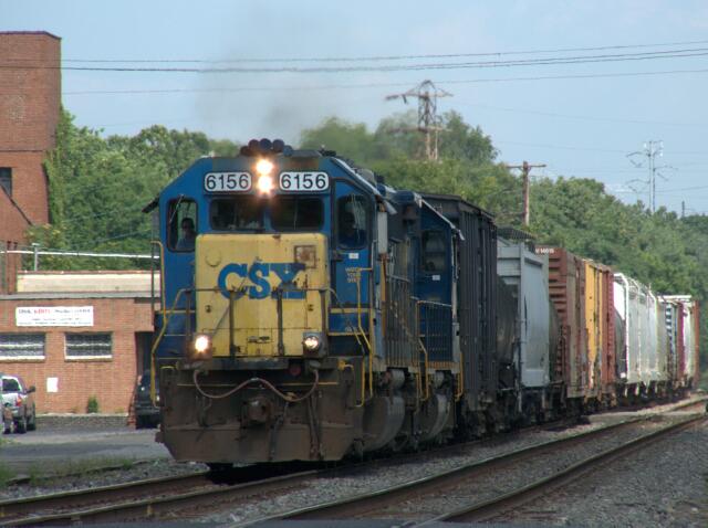 | Just as CSX B738 blasts through Bridgeport PA on NS Harrisburg Line, a mischievous cloud creeps into the picture. They have made pretty good time, departing Lansdale at 12:05, calling South Philly yard dispatcher at 14:05 to inform him that they were coupled up with a marker and ready to go, and now approaching Abrams Yard about 15:30. |