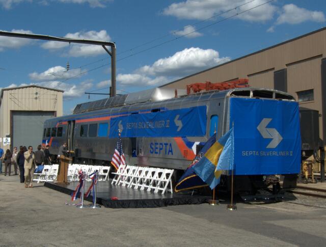 | SEPTA held a ceremony today at Wayne Electric Shop to officially unveil the mockup of the Silverliner V to invited guests and dignitaries. |