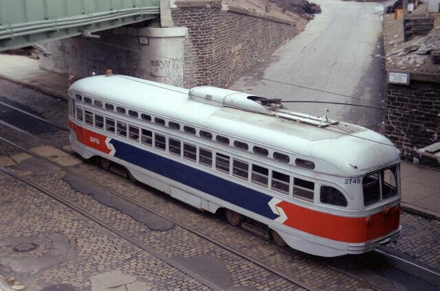 | Below and between the SEPTA Main Line to the right and the Chestnut Hill East Line to the left, PCC 2748 rolls up Germantown Avenue toward Chestnut Hill on SEPTA Route 23. |