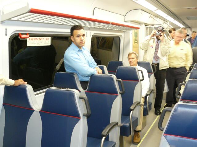 | Dozens of people strolled through the finished end of the car, checking out the seats and perusing the details of the latest in public transportation. |
