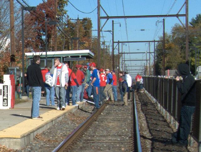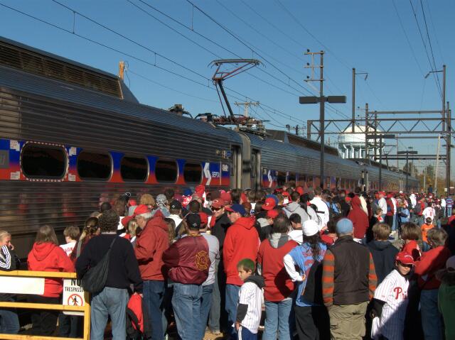 | Around 10:45, the announcement over the station public address system instructed passengers that, due to the massive response to take mass transit down to the parade, the system was overwhelmed and that passengers should seek alternate transportation. The immediate result was that about half the crowd abandoned the station, leaving about 500 hopeful people remaining. With the schedule thrown completely out the window, SEPTA finally got a train (originally destined for Doylestown) into Lansdale around 11:00. |
