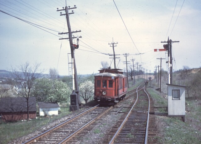 | LVT freight trolley 79 stops at School Siding near Center Valley PA on May 8 1950. Here the right of way looks like that of a railroad. |