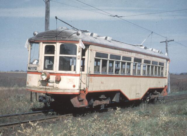 | Three years later, LVT 701 has a new paint scheme as it races south through Hatfield between Stop 54 and Couter Siding in Lansdale on October 22 1950. |