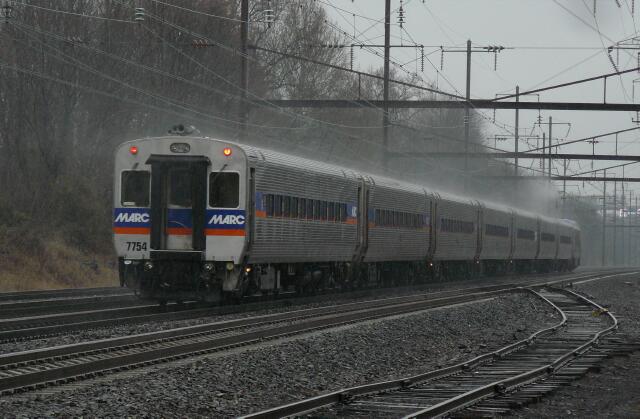 | and six Sumitomo coaches trailed by cab car MARC 7754. |