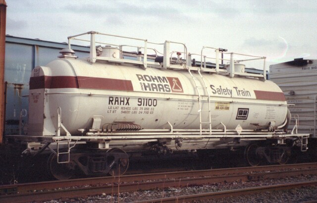 | At the end of the day April 1 2009, Rohm and Haas Corporation, a Philadelphia institution for almost a century, will complete the deal that will see it become part of Dow Chemical. Rohm and Haas operates a number of facilities across the nation and around the world and, as a subsidiary of Dow, its headquarters will remain on Independence Mall, right across from the Liberty Bell. From the railroad side, its two large chemical plants in Philadelphia and Bristol are still serviced by Conrail SAO (as an aside, April 1 is also Conrail's birthday). An important part of the chemical business is safety, and to this end Rohm and Haas maintained a rolling classroom in the form of its "Safety Train". The cars of the "Safety Train" made stops around the United States where they provided the opportunity for company employees and personnel from local emergency agencies to obtain hands-on training in an instructional setting. |