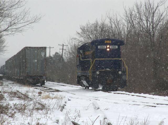 | Waiting for B738 just north of Washington Street in Telford was ESPN B23-7 3153, which had just brought down out of storage trash flat cars and sulfur tank cars. |
