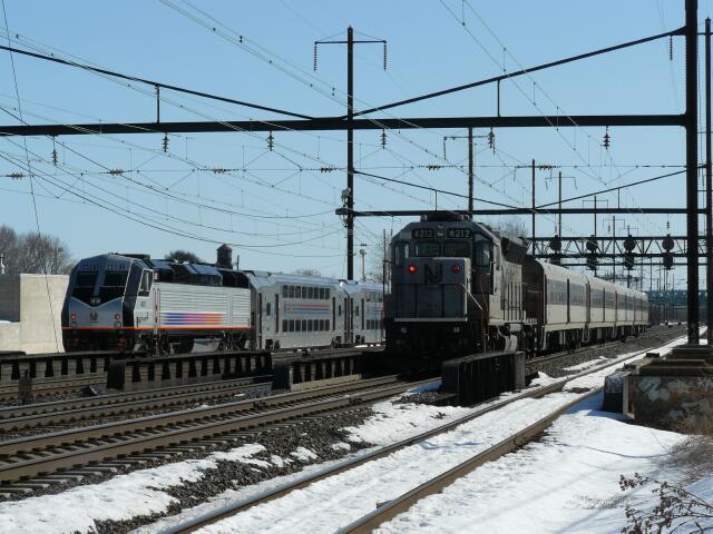 | Train 7181 pulled onto Track 5 just west of Shore Interlocking to allow the engineer to change ends, and it is joined by NJT Train 4671 with NJT GP40PH-2B 4212, both waiting for Train 4668 from Atlantic City to clear before proceeding to the shore. |