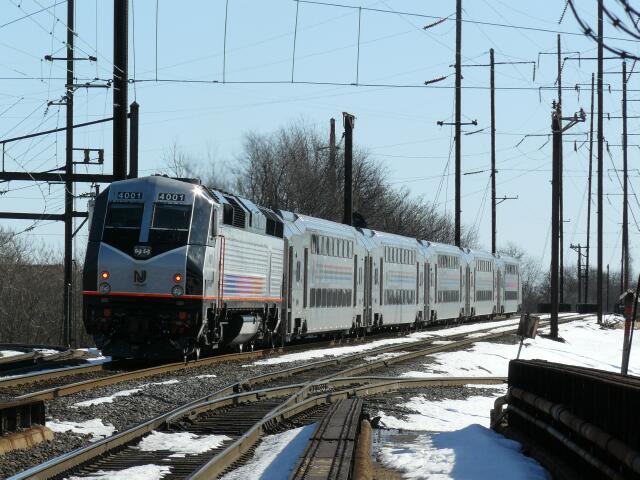 From its inception until last weekend, the Atlantic City Express Service (ACES) trains running between New York City and Atlantic City consisted of an NJT (former Amtrak) P40DC diesel engine on one end, four ACES double decker cars in the middle and an NJT ALP-44 electric engine on the other. The arrangement allowed the train to access the tunnels to NYC using the electric and run the non-electrified Atlantic City Line using the diesel for one seat service. On February 13 2010 NJT P40DC 4800 on the hind end of Train 7174 caught fire near Morrisville PA and shortly afterward NJT withdrew the P40DC's from service. The P40DC's were replaced by NJT PL42AC diesel engines and, since the PL42AC's do not have the clearance to operate in the tunnels to NYC, the electrics were also removed from the trains. Now ACES passengers must take regular NJT trains between Newark and NY Penn Station to connect with the ACES trains in Newark. They have added to the north end of the train an NJT double decker coach for use as a cab control car (but not for passenger use), with the PL42AC on the south end and the four ACES cars in between. There is currently no public information available regarding how long this arrangement will last. Train 7181 with NJT PL42AC 4001 rounds the curve at Frankford Junction. |