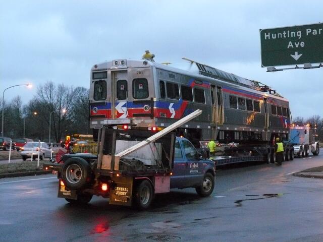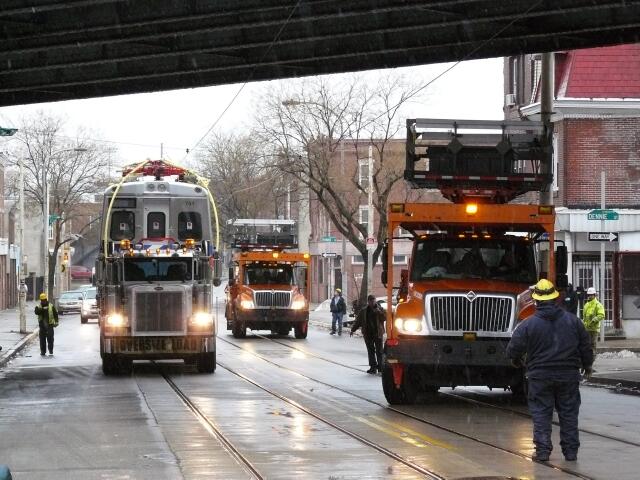 | Finally 701 clears the trackless trolley wires near Wayne Junction Station and all that is left is some heavy lifting. |